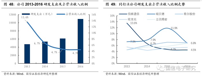公司历年研发投入虽不断增长,但占营业收入比例不断下降,2016年公司研发支出占比仅为4.5%。与同行业其他公司相比,专注天线行业的另外一家上市公司硕贝德研发支出占比明显高于信维,2016年为其研发投入占比最低年份,仍有6.8%。其他公司如歌尔股份、欧菲光、立讯精密研发投入占比均稳中有升,均高于公司研发投入占比。