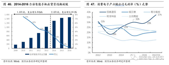 我们对比信维通信、硕贝德、歌尔股份、欧菲科技、立讯精密等优秀公司。智能手机行业普及以来,按全球出货量增速可以划分为两个阶段:2009-2013年为第一阶段,在此期间智能手机出货量年复合增长率高达56%,市场空间迅速扩大,同业竞争强度较低,该阶段进入手机产业链的公司如欧菲科技、硕贝德、歌尔股份,其毛利率在第一阶段均维持在较高水平;