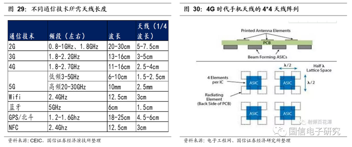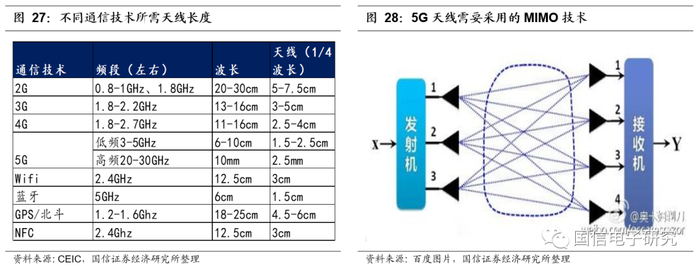 根据远距离通信设计原理,天线的长度理论上是1/4波长可以使通信效率最大化。手机中充满了天线,从GPS、蓝牙、wifi、2G、3G、4G等频段。频率越低,尺寸越大。5G采用的高频段将大幅缩小天线尺寸,增加加工工艺难度。而自选基站能力的要求需要5G手机采用阵列式的天线设计(MIMO技术),需要利用垂直和水平天线交叉的点阵,以同时保证垂直和水平两个极化方向的信号收发。