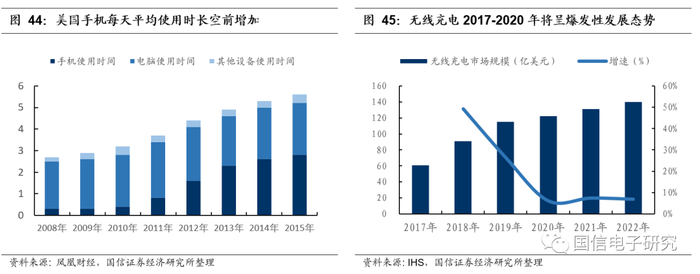 无线充电在5G时代空前重要。5G带来速度提升、超高清内容、更好的手机上网娱乐体验的同时,必然带来手机使用时间的进一步增加。4G时代手机每天使用时长首次超过电脑,由此带来手机电池容量与手机充电频率的大幅增加。目前手机电池单位体积内容量提升缓慢,短期内难有大的突破;由于需要较好的握持体验,5G时代手机尺寸也不会有大幅增加,因此电池容量增加的空间有限。相比之下,无线充电成为了一个较好的解决方案。若未来充电装置都采用同一标准并大范围安置于公共场所,如咖啡店,酒吧,机场,酒店或快餐店的桌子上,有可能实现随时随地为手机充电。根据IHS预测,无线充电发射端与接收端的市场规模2020年有望分别达到99亿和26.9亿元,2014-2020年间的复合增长率在40%左右。