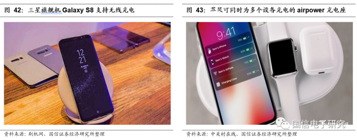 苹果\三星引领无线充电发展。苹果三星作为消费电子的引领者,在新技术导入上起着非常重要的领导作用。三星已经在无线充电领域耕耘多年,其最新旗舰机Galaxy S8、Note8上均支持无线充电,并逐渐开始向中低端C、J系列搭载无线充电模块。苹果在新一代iphone全系列支持无线充电,这会明显增加无线收发模块的需求量,同时将起到更加明显的示范作用,国内厂商有望迅速跟随推出更多支持无线充电机型。