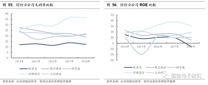 天线,射频连接器、屏蔽件等产品表现出来的特征都是定制化程度较高,公司配合客户投入较多的研发,变现形式则是公司在技术上的附加值都提现在产品中去。从财务指标上来看,公司体现出较高的毛利率,净利润以及ROE水平。