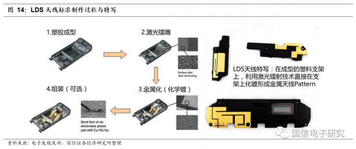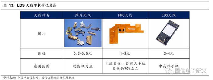 与弹片天线和FPC天线相比,LDS天线可以直接利用激光成型技术将天线电路成型在三维塑料器件上,能与手机外壳更好的集成,在手机天线数量日益增多,集成度不断提高的今天,LDS天线具有更小体积、更稳定的性能等优点,因此逐渐成为高端手机的标配。LDS天线单体价格为3-4元,是弹片天线价格的10倍左右,是FPC天线的2倍左右。