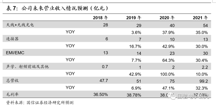 (1)天线+无线充电业务;伴随着公司的产能持续释放,叠加5G手机LDS天线价值量的翻倍提升,同时LCP开始导入部分客户,长期有望进入A客户供应链。无线充电已经切入三星、华为、苹果等高端机型,公司一体化布局覆盖无线充电上下游产业链,有望在大客户份额进一步提升-。预计天线+无线充电业务20/21年营收增速38%/35%。