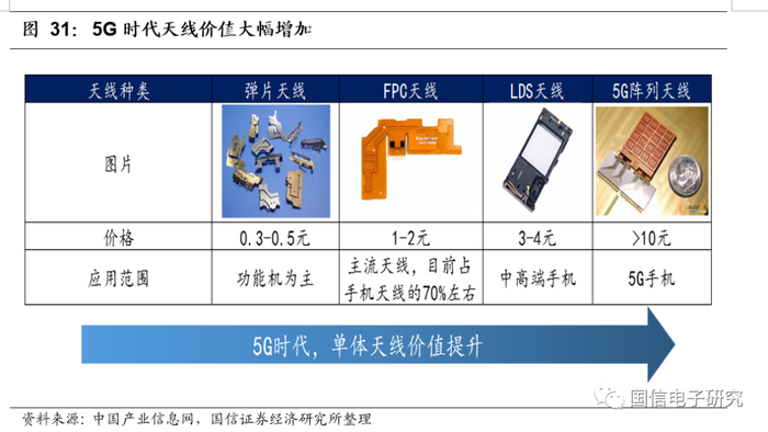 目前市场上多数手机仅仅支持MIMO2x2技术,如若采用 MIMO64x8技术,基站天线的配置数量需要增长 31倍,手机天线数量需要增长8倍。5G终端天线,对周边金属很敏感,不能被金属遮挡, 适合3D空间扫描,5G天线是一个含芯片的模组;单个5G天线的价值量将大于10元,是目前高端LDS天线的3倍以上。