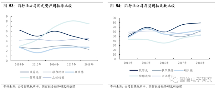 相比同行业其他优质公司,公司整体运营能力较为突出。从2013年整合莱尔德进入大客户之后,随着业务供货价值的提高,公司固定资产周转率逐步提升。同时公司存货管理能力较强,存货周转率较高,存货周转天数保持在1.5个月左右,保持较高的效率。