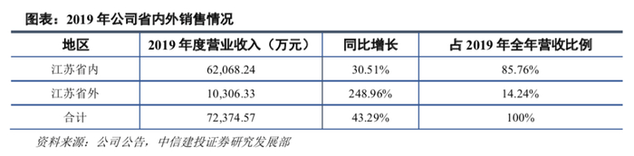 公司机器人应用场景实现从巡检到操作的突破,最具代表意义的就是室外带电作业机器人和室内巡检操作机器人。室外带电作业机器人Z100应用于10kV高压线,可在不停电状态下实施支线线路的引线搭接任务,代替人工完成高压线的剥线、穿线、搭线、紧固线夹等复杂带电作业工作;2019年年底,公司与国电南瑞、天津三源电力合资成立国网瑞嘉,加快实现带电作业机器人产品的研发和产业化。公司室内巡检操作机器人D100,实现了巡检、操作一体化融合,除具备巡检功能外,还可在不停电状态下替代人工完成开关柜的运行、热备用、冷备用、检修等状态间的切换工作,以及变电柜紧急分闸操作。一直以来,大家对亿嘉和省外市场的拓展情况非常关注。从2019年的销售数据来看,2019年江苏省外区域实现销售收入1.03亿元,同比+248.96%,占全年营收比重的14.24%。省外市场取得突破性进展,市场空间进一步打开。