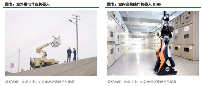 公司机器人应用场景实现从巡检到操作的突破,最具代表意义的就是室外带电作业机器人和室内巡检操作机器人。室外带电作业机器人Z100应用于10kV高压线,可在不停电状态下实施支线线路的引线搭接任务,代替人工完成高压线的剥线、穿线、搭线、紧固线夹等复杂带电作业工作;2019年年底,公司与国电南瑞、天津三源电力合资成立国网瑞嘉,加快实现带电作业机器人产品的研发和产业化。公司室内巡检操作机器人D100,实现了巡检、操作一体化融合,除具备巡检功能外,还可在不停电状态下替代人工完成开关柜的运行、热备用、冷备用、检修等状态间的切换工作,以及变电柜紧急分闸操作。