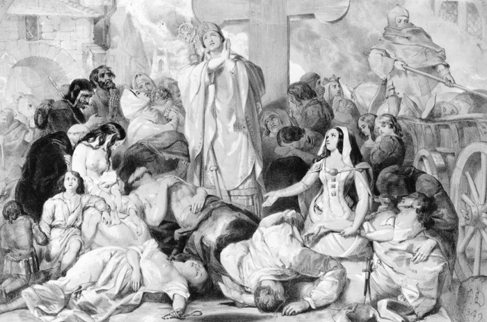 这场黑色瘟疫从1347年意大利的热那亚开始流行,席卷了整个欧洲和世界不少地区,持续了3个年头,死亡2500万人。当时欧洲总人口也还不到8000万。