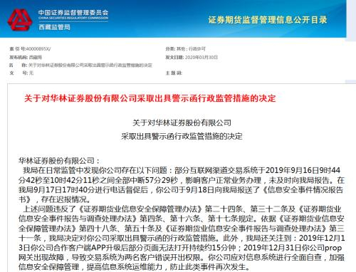 例如,今年3月,鲜有监管动态的西藏证监局即对华林证券开出警示函,原因是其部分互联网渠道交易系统在2019年9月16日9时44分42秒至10时42分11秒之间全部中断57分29秒,影响客户正常业务办理,且未及时向西藏证监局报告。在证监局9月17日电话催促后,至9月18日华林证券才报送报告,存在迟报情况。