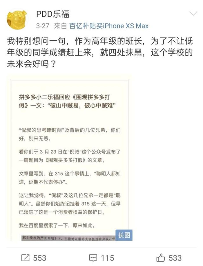 3月27日,拼多多小二乐福发微博回应《围观拼多多打假》一文,其中提到,“因为担心公众对拼多多的印象转好,竞争对手为把拼多多拉入精心设计的‘假货山寨’泥潭,便由其能控制的自媒体矩阵代笔。”