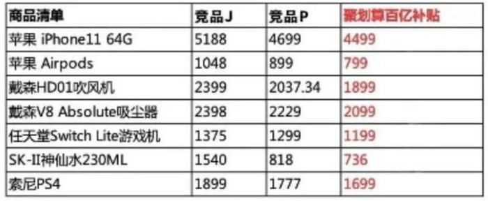 2019年双12期间,聚划算推出了“百亿补贴”后价格,当时有人统计了聚划算的价格和另外两家电商平台的价格,进行对比,聚划算给出了更大额优惠。至此,淘宝和拼多多的“百亿补贴”正式拉开帷幕。