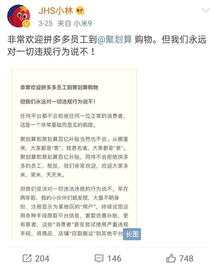 后来,阿里巴巴聚划算回应称,发现有些“用户”存在违规手段,试图用各种手段爬取平台信息,侵犯权益且扰乱环境,阿里巴巴对此类违规做出了相关限制,“对一切伤害消费者和商家的行为永远说不”。聚划算平台小二在官方微博艾特拼多多,说非常欢迎来聚划算购物。