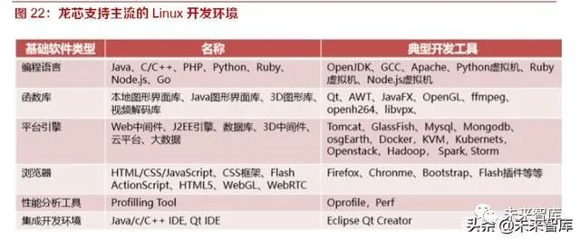 在应用开发环境建设方面,龙芯支持主流的 Linux 开发环境,包括多种编程语言、函数库、平台引 擎和集成开发工具等。