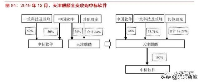 中标软件和天津麒麟在操作系统技术、产品、企业资质、产业链配套、市场应用等方面处于优势地 位,在政务、国防、金融、能源、交通、医疗等行业已经获得广泛应用和认可。2019 年 12 月,天 津麒麟全资收购中标软件,收购完成后,新公司为麒麟软件。我们认为,两大优势操作系统企业的 深度整合,有望形成优势资源互补,成为麒麟软件坚实的技术和市场基础。