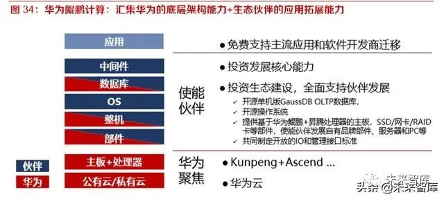 以“ Kunpeng+昇腾”算力为中心,华为鲲鹏产业已经聚集了众多产业合作伙伴,涉及应用软硬件、 开发、人才培养等全方位的鲲鹏生态体系已经建立。