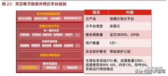 龙芯在信创云计算的典型案例是和浪潮云合作的电子政务外网云平台。基于龙芯 CPU 和 Docker 技术,依托浪潮云计算中心构建的电子政务外网云平台,可以支撑省市县三级应用,用户数达到了 5 万+规模,实现了办公系统、信息门户、统一认证和授权管理系统、电子签章系统等上云部署。