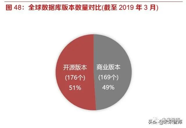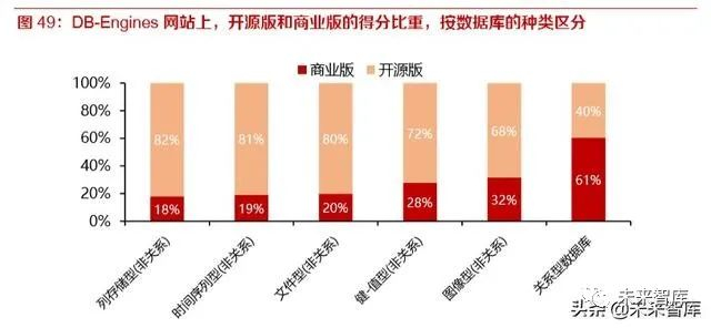 开源版本主要在非关系型数据库市场获得青睐,而关系型数据库市场仍然由商业版本主导。根据 DB-Engines 网站上对各个类型的数据库的得分对比来看,开源版本的数据库在几大类非关系型数 据库(列存储、时间序列、文件型、健-值型、图像型)的欢迎程度较高。而在关系型数据库领域,商 业版本仍然占据主导地位。非关系型数据库兴起时间较短,主要伴随互联网兴起而发展。非关系型 数据库更强调灵活度,而不是数据一致性。对于强调稳定的数据一致性的领域,也就是关系型数据 库领域,商业版本的技术积累时间更久也更成熟。