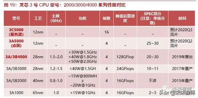 龙芯 3 号 CPU 下一代 5000 系列的目标:提高主频和核数。龙芯新一代桌面芯片 3A5000 将在 2020 年 Q2 流片,采用 12nm 工艺,单核性能提高至 25-30 分,与 3A4000 可原位替换,操作系 统二进制兼容;龙芯服务器芯片 3C5000 预计于 2020 三季度流片,采用 12nm 工艺,16 核结构, 支持 4-16 路服务器。