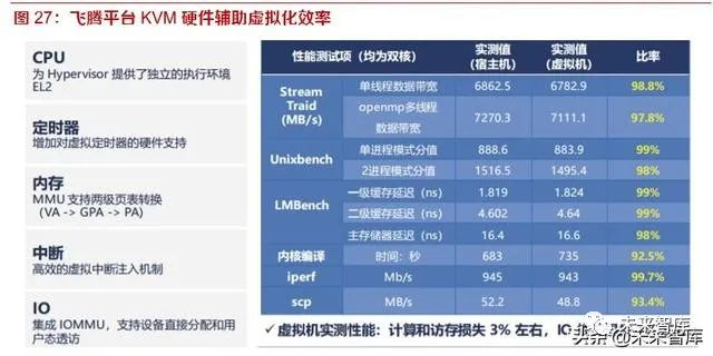 针对云计算平台的虚拟化方面,飞腾服务器芯片提供了较好的硬件辅助虚拟化支持。在 FT2000+/64 服务器上对比了虚拟机双核(采用 KVM 虚拟化)和宿主机双核在基准测试中的效率 比值,平均约为 97.5%左右,这为基于 KVM 虚拟化的云平台性能提供了强有力的支撑。
