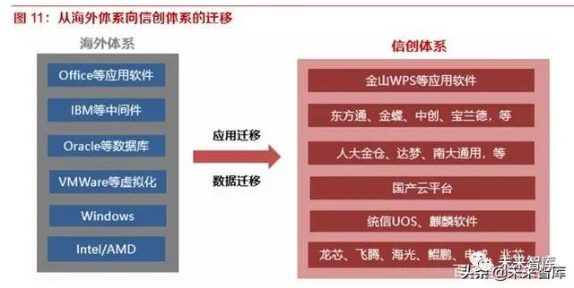 迁移成本将成为国产软硬件信创推广的重要考量,本质取决于生态建设的进度。虽然常用的应用 软件已经基本实现了国产化的覆盖,但是仍然有一部分行业应用软件是基于原有的底层架构开发 的,比如基于 Oracle 数据库或者针对 Windows 系统的。短期内,凭借有限的资金和人力资源,并 不能做到针对所有的应用软件都推出相应的或者相当水平的国产化版本。而且,过去一些机构部门 的软件平台由外包团队开发,版本较多、技术路线较复杂,需要确保现有的应用、数据、文档实现 顺利迁移、低成本迁移、甚至无缝迁移。