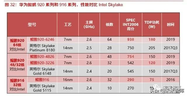 根据华为开发者大会 2020(cloud)公布的数据,相比英特尔 Skylake 服务器 CPU,华为鲲鹏 920 系 列芯片的性能更高,功耗更低,主要得益于鲲鹏 920 的工艺升级到了 7nm,内核数量更多,而且 进行了多核优化处理。