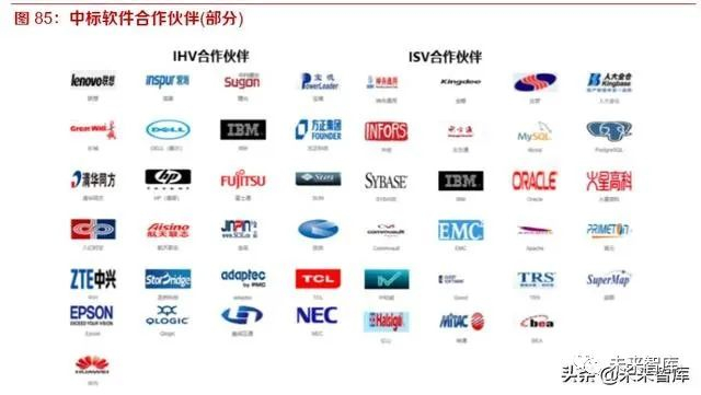 完善的软硬件体系:在生态兼容方面,中标软件在长期的发展历程中,积累了成体系的 IHV(独立 硬件厂商)和 ISV(独立软件厂商)合作伙伴,涉及芯片、整机和服务器、中间件、数据库、应用软 件等等。