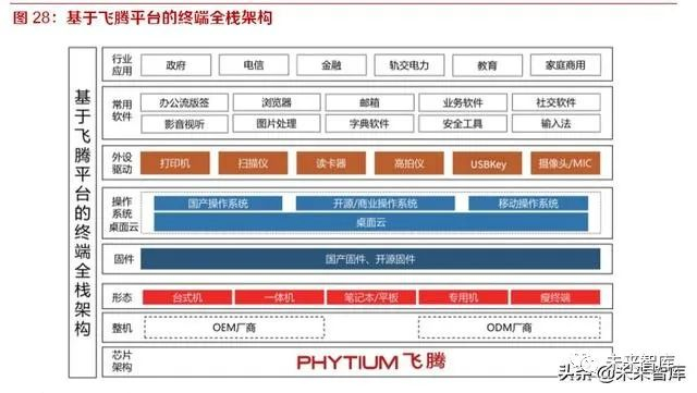 生态建设:飞腾通过性能强大、低功耗的桌面 CPU,构建了终端全栈生态。终端全栈架构包括硬 件层,固件、操作系统及驱动层和应用层。