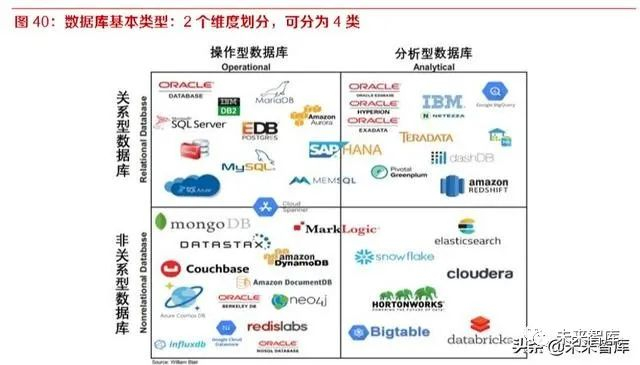 数据库根据数据结构和功能这两个维度进行划分。根据数据结构,可分为:关系型数据库、非关系 型数据库;根据功能不同,可以分为:操作型数据库、分析型数据库。