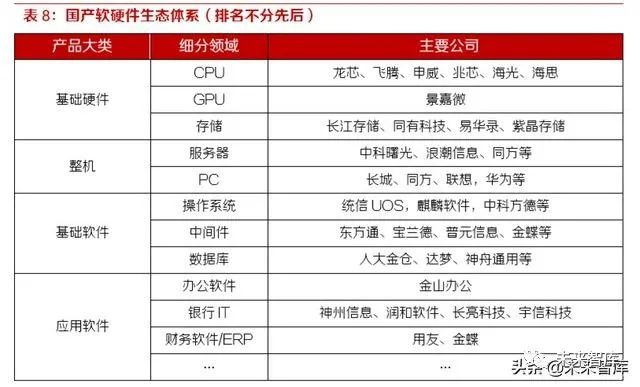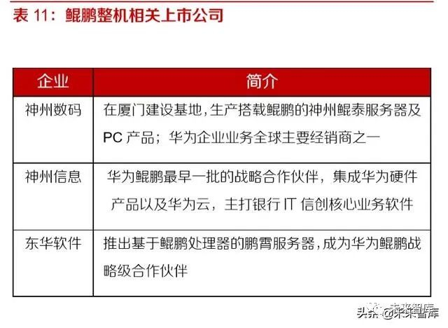 国产基础软硬件厂商在产业合作和集团层面存在一定的渊源。中国电子信息产业集团(CEC)旗下的 中国长城、中国软件、天津飞腾、麒麟软件、武汉达梦,分别涉及整机、系统集成、国产 CPU、 国产操作系统、国产数据库几个领域,尤其是天津飞腾、麒麟软件长期合作形成的 PK 体系(新加 入奇安信,成为 PKS 体系)。围绕华为鲲鹏芯片和华为云,相关的生态合作厂商众多,涉及整机、 软件应用、系统集成等各个层面。例如,神州数码是华为企业业务的全球性总经销商,启动“大华 为”战略,深度绑定鲲鹏产业链,而且建设神州鲲泰厦门生产基地,主要生产搭载鲲鹏芯片的神州 鲲泰服务器及 PC 产品;神州信息是华为鲲鹏最早一批的战略合作伙伴,在银行信创领域主推自研 的分布式核心软件、鲲鹏系列产品的硬件集成方案。