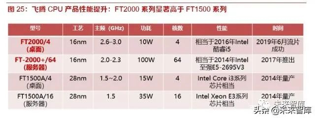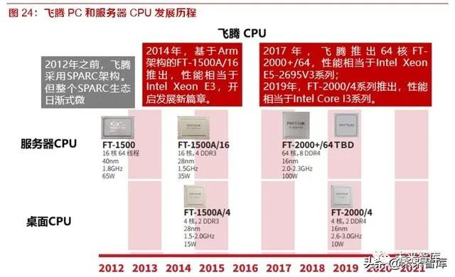 2)新篇章:基于 ARM 架构(2014-至今),性能显著提升、生态建设顺利推进。2014 年飞腾基于 ARM 架构的 FT-1500A 推出,性能相当于 Intel Xeon E3,从此开启了技术发展的新篇章。2017 年,飞腾推出 64 核的 FT-2000+系列。2019 年,飞腾桌面版 FT-2000/4 问世,采用 16nm 工艺, 性能相当于 Intel Core i3 系列。