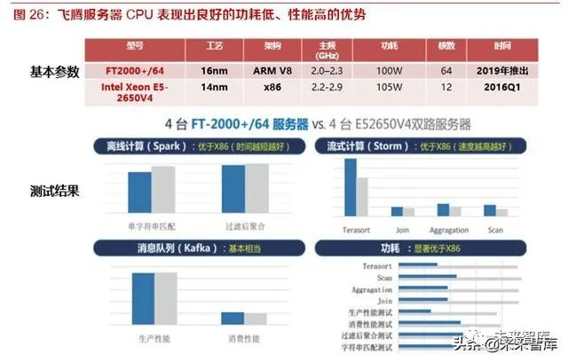 飞腾基于 ARM V8 架构的服务器 CPU,相比 x86 架构的海外厂商产品,优势在于多核处理能力和 功耗上面。在 2019 年的某项目中,4 台基于飞腾 FT-2000+/64(64 核,16nm)的单路服务器和 4 台 搭载英特尔至强 E5-2650V4(12 核,14nm)的双路服务器在大数据方面进行了对比测试。在 Storm 测试中,飞腾的各项测试均相当或占优。在离线计算 Spark 测试中,飞腾得益于其多核处理能力, 也实现了性能占优;在消息队列 Kafka 测试中,飞腾的性能和 x86 服务器基本相当。飞腾的功耗仅仅为对方的 50%。体现出了飞腾对大数据组件,尤其对离线计算的良好支持,也体现了飞腾 CPU 的节能。
