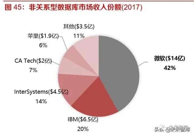 全球数据库的市场份额(商业版)仍然存在少数寡头垄断局面。从市场份额来看,根据 IDC 数据, Oracle、微软、 IBM 占据了关系型数据库收入份额的 79%,垄断地位较高。非关系型数据库中,微 软、IBM 和 InterSystems 的收入份额占全球前三,总计为 76%。整体来看,商业版本市场中,少 数寡头的市场地位仍然较高。