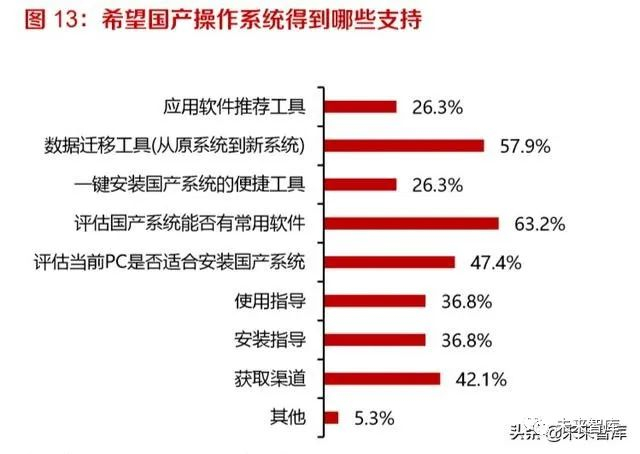 以国产操作系统为例,潜在用户群体最关心的是兼容和迁移问题。2020 年 4 月初,计世研究院发 布了关于“国产操作系统使用意愿调研”的问卷调研结果,调查对象主要为国内的 IT/电信/互联网、 政府/公共事业、能源制造等企业。根据本次的统计结果,国产操作系统潜在用户最关注的两个问 题:1)常用软件能否兼容;2)从原来的系统到国产系统,应用和数据能否顺利迁移。