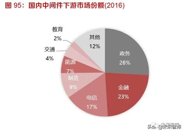 根据计世资讯(CCW Research)发布的《2018~2019 年软件基础设施(中间件)市场发展趋势研 究》报告,2018 年国内中间件市场规模 65.0 亿元,估算 2019 年中间件市场规模为 72.4 亿,同 比增长 11.4%。根据计世资讯的数据,国内中间件的下游客户主要包括政务、金融、电信三大领域, 分别占据 26%、23%和 17%的市场份额。