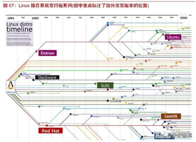 Linux kernel(内核)由 Linus Torvalds 在 1991 年发布,代码免费公开,由全球开发者共同贡献, 已成为影响最广泛的开源软件项目。以 Linux 内核为基础,不同的开发团体(开源社区、企业、个 人等)对内核代码进行一定的修改和补充,加入 GUI(图形界面)、应用等部分,形成了相应的 Linux 操作系统发行版。Linux 系统版本之间存在衍生关系,由此形成 RedHat、Slackware、Debian 等 几大家族,各家族内部又衍生出一些著名版本,如 Ubuntu、SUSE、CentOS、Red Hat Enterprise Linux、Fedora 等。