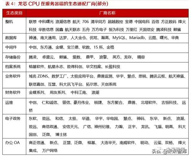 服务器生态领域:龙芯目前的 3B4000 服务器芯片是 4 核的,可以支持双路、 四路全相连结构, 实现了虚拟机效率提升至 95%以上、跨片访存带宽提升至 400% 以上、内存数量线性扩展以及高 吞吐率。目前也已经有百款厂商适配了龙芯的服务器 CPU。我们认为,龙芯新一代 16 核的服务器 CPU 在 2020 年内流片之后,龙芯在服务器领域的市场影响力将进一步得到增强。