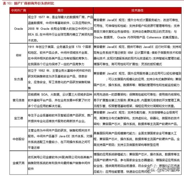 IBM 和 Oracle 进入国内市场的时间较早,凭借先发优势和技术实力曾经一度垄断国内厂商。而随 着东方通、宝兰德、普元、中创、金蝶天燕等国产厂商的技术积累逐渐成熟,对于海外厂商的替代 也在逐步进行。