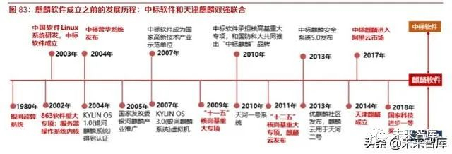 麒麟软件是中国软件旗下的国产操作系统公司,由中标软件和天津麒麟于2019年12月整合而成。 中国软件成立于 1980 年,是中国电子信息产业集团有限公司控股的上市公司,是国内软件行业的 先行者之一。中国软件打造了完整的从操作系统、数据库、中间件、安全产品到应用系统的产品链 条;在全国税务、党政、交通、知识产权、金融、能源、医卫、安监、信访、应急、工商、公用事 业等国民经济重要领域都有广泛的客户群体积累。中国软件是首批通过全国“软件企业”认证的企 业,连续多年被评为“国家规划布局内重点软件企业”,并入选国家软件百强企业。