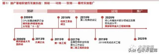 国产基础软硬件生态以 2006 年的“核高基”为基础和前提,自 2015 年开始进入“可用”阶段。 2006 年发布的《国家中长期科学和技术发展规划纲要(2006 年-2020 年)》,将“核心电子器件、 高端通用芯片及基础软件产品”列为 16 个科技重大专项之首,简称“核高基重大专项”。2008 年, “核高基”经审议通过,并正式实施。“十二五”(2011-2015)期间,核高基重大专项以满足国家 信息产业发展重大需求的战略性基础产品为重点,突破高端通用芯片和基础软件关键技术,研发自 主可控的国产中央处理器(CPU)、操作系统和软件平台、新型移动智能终端、高效能嵌入式中央 处理器、系统芯片(SOC)和网络化软件,实现产业化和批量应用,初步形成自主核心电子器件产 品保障体系。整体来看,2015 年是国产基础软硬件发展的分水岭。2020 年的信创推广,则有望进 一步形成全局推进的协同效应,实现向“好用”的升级。