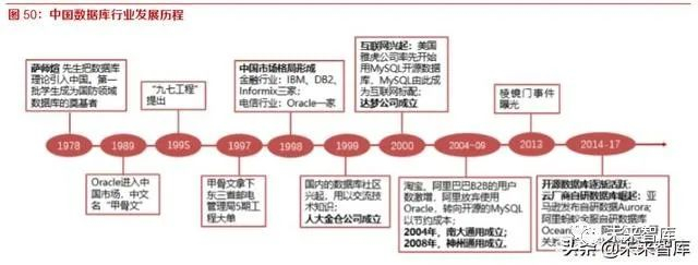 国内的数据库理论最早在 1970 年代引入,在部分领域进行了自研,但在发展早期,市场仍然由 Oracle、IBM、DB2、Informix 主导。随着互联网兴起,MySQL 等开源数据库被互联网厂商青睐, 互联网行业的飞速发展也带动了国内对于数据库技术和知识的重视程度,人才资源逐渐积累。在 90 年代末和 21 世纪初,重要的国产数据库公司成立,并开始进入市场。随着云计算的发展,云厂商 针对云的业务场景自研的数据库也登上了历史舞台。整体来看,Oracle、IBM 等海外厂商在国内 的市场地位不断削弱,属于国产数据库的行业空间逐步展开。