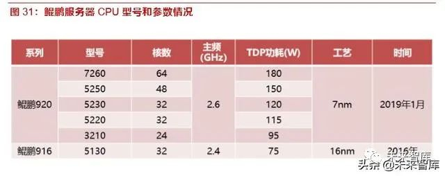在通用计算领域,鲲鹏 CPU 目前主要集中在服务器领域。鲲鹏 920 服务器 CPU 基于 ARM V8 多 核架构,最高集成 64 个物理核,主频最高 2.6GHz,通过多核来提升算力。另外,华为鲲鹏 PC 级 的 CPU 也在规划中。