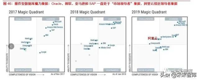 云计算厂商崛起,逐渐加入市场领导者阵营。根据 Gartner 在 2017/2018/2019 公布的操作型数据 库魔力象限,Oracle、微软、SAP 和亚马逊一直处于“市场领导者”象限,而阿里云在 2018 年位 列“市场前瞻者”象限,2019 年位列“挑战者”象限,在得分位置上接近领导者象限。其中,Oracle 代表传统的主流数据库厂商,亚马逊和阿里云代表崛起的云计算厂商。