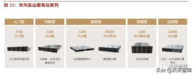 华为推出了基于鲲鹏 CPU 的泰山服务器系列,包含多个种类。根据华为 2019 年的生态大会公布 的信息,华为未来将重点聚焦于算力的上游,进行生态伙伴赋能,未来有可能逐渐退出服务器整机 领域。我们认为,随着华为生态建设的逐步完善和厂商对鲲鹏 CPU 接受度进一步提高,华为鲲鹏 CPU 未来有望不依赖于华为自己的服务器整机进行推广,从而实现战略升维。