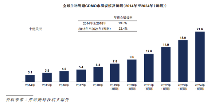 随着大量中小型生物制药公司的出现,全球生物CDMO市场规模2018年-2014年以22.4%的年复合增长率增长,预计在2024年将达到216 亿美元。
