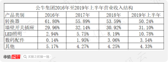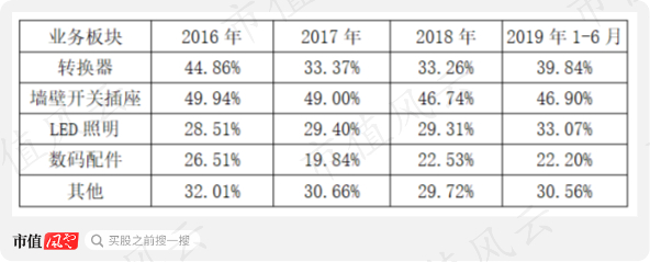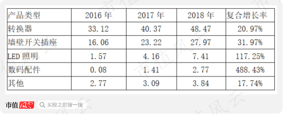 其中转换器产品主要包括有线插座、无线插座、USB插座、旅行转换器等;墙壁开关插座产品主要分为装饰开关插座和白开关插座;LED照明产品主要为包括LED球泡灯和灯贴在内的光源类产品和筒灯、灯带等灯具类产品;数码配件产品主要包括数据线、车充、移动电源、充电头、无线充电器等。