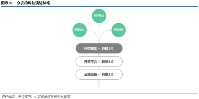 从科技1.0到科技3.0。众安的科技板块经历了从云端系统的科技1.0到开放平台的科技2.0再到科技输出的科技3.0的演变过程,1.0时期以“无界山”云平台技术为基础,完全在云平台上运作核心保险系统,在营销、承保、定价以及索赔处理及理赔等各个环节应用大数据分析及人工智能,自行处理大量复杂的数据,大幅降低成本、提升运营效率;2019年,众安科技投入同比增长14.65%,并于今年12月全面升级保险核心系统,从无界山1.0迭代至到无界山2.0。2.0时期逐渐搭建开放平台,通过不同的技术和机制将保险产品嵌入各种生态系统、包括标准API、嵌入式页面组件及嵌入到操作系统中的软件开发套件,通过开放平台实现外部伙伴快速对接,为生态系统合作伙伴及金融业其他参与者提供数据、技术及模型解决方案。2016年成立众安科技向海外输出科技能力,并逐渐开启科技3.0阶段,2019年,众安科技输出收入与去年同期相比实现1.4倍增长,在马来西亚等地区落地。今年7月,众安科技与Grab合作定制马来西亚首款按日付费互联网商业车险,在8小时内积累了1万司机用户,出具2万保单,截至目前出单超过300万。8月与NTUC INCOME合作上限CIPPT。