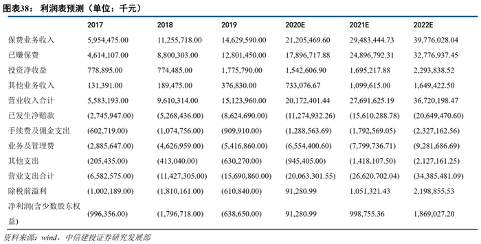 基于众安保险业务质量2019年改善明显,综合成本率降低、净利润亏损同比大幅收窄,随着保险科技技术成果日渐成熟、保费增长带来的规模效应将逐步显现,综合成本率持续优化,我们预期公司2020/2021/2022年综合成本率分别为105%/99.3%/96.7%;归母每股净资产分别为10.73/11.37/12.58元,每股净利润分别为0.06/0.68/1.27元,ROE分别为0.6%/6%/10%。