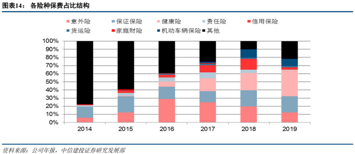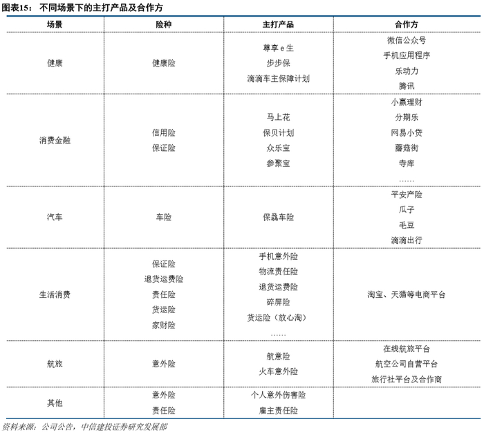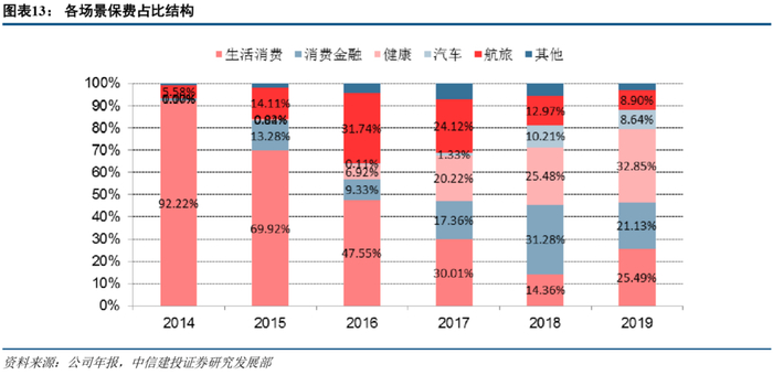 针对因旅行产生的各类风险,如旅行意外、航班延误及航班取消提供保障,自2015年起与携程合作提供航班延误险,拓展至与其他主要互联代理、航空公司及线下旅游代理合作。2019年总保费13.025亿元,同比下降10.8%,主动缩减部分承保质量较低、渠道费率偏高的业务,使得航旅生态的渠道费率下降2.7pct.至86.5%,赔付率下降2.9pct.至8.6%。