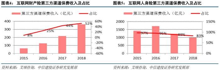 线上业务的关键是客户流量与客户留存,其背后的引擎则是科技力量支撑与生态网络的构建。与传统渠道相比,互联网渠道内的保险产品场景化属性更强,客户的触达和互动频次更高,用户的购买行为主动性更强。互联网保险销售渠道主要分为官方自营渠道(官网、app、小程序等)和第三方渠道(第三方网络平台、保险中介),由于长期寿险、健康险条款相对复杂,消费者自主购买能力较弱,且对互联网场景依赖性不强,因此可能会更倾向于借助第三方平台流量进行销售转化,例如人保健康与支付保合作推出的“好医保·长期医疗”产品(6年保证续保)、以及长期期交重疾险“健康福”;根据艾瑞咨询数据显示,互联网人身险第三方渠道保费收入占比2018年为83%,但随着传统保险公司对自有网络渠道重视程度越来越高,这一比例有下降趋势。而财产险、短期健康险、意外险等小额短期产品标准化程度较高、条款简单容易购买,在承保端数字化水平较高,大多数参与者已经开始通过线上渠道进行产品销售,并结合场景进行产品定制,例如众安保险与蚂蚁、腾讯、淘宝、携程等众多第三方平台合作,构建消费金融、健康、汽车、航旅、生活金融五大场景下的生态系统,在不同的场景中触达不同需求的客户,增强销售精准性,通过构建闭环生态系统来增加用户留存。得益于互联网保险产品结构的不断优化,在互联网保险整体保费增长疲软的背景下,通过第三方渠道产生的保费在互联网财产险领域依然保持快速增长。总体来看,在线上业务的建设拓展初期,保险公司自建生态系统引流能力有限,仍然会寻求第三方社交、健康管理、支付平台的支持,通过付出高额的第三方渠道费用为自己建立业务生态。因此线上流量抢夺以及增强已获取用户的活跃度与粘性将是传统保险互联网化的关键因素。